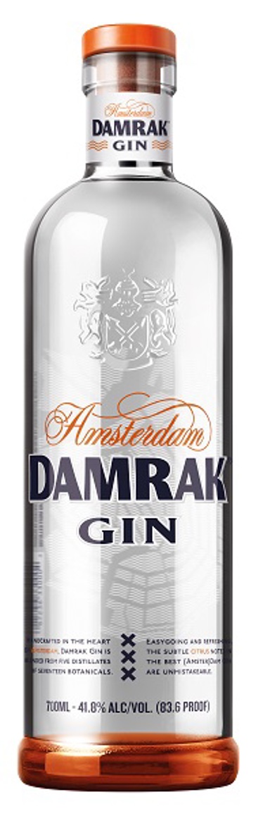 Schenk de Damrak Gin in een met ijs gevuld groot glas.